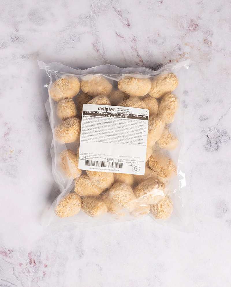 Croqueta de intenso aroma y sabor a crustáceo, con el característico color anaranjado-rojizo que aporta el carabinero. Elaborada con una bechamel cremosa y un tropezón generoso, que garantiza matices marinos en el paladar. Su empanado con Panko crujiente y resistente mantiene la textura perfecta tras la fritura, haciendo de esta croqueta una pieza gourmet.