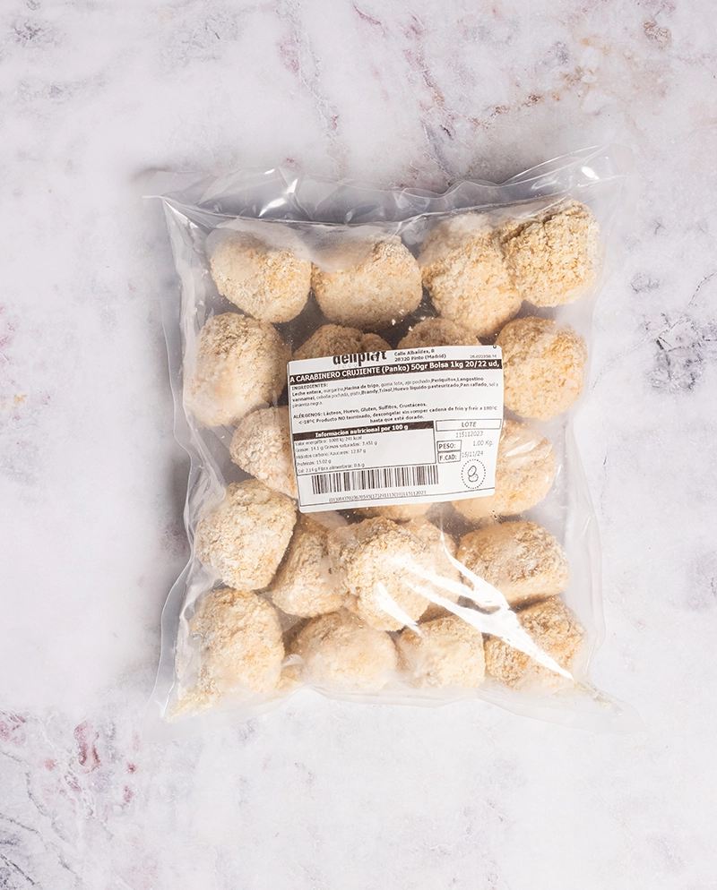 Croqueta de intenso aroma y sabor a crustáceo, con el característico color anaranjado-rojizo que aporta el carabinero. Elaborada con una bechamel cremosa y un tropezón generoso, que garantiza matices marinos en el paladar. Su empanado crujiente y resistente mantiene la textura perfecta tras la fritura, haciendo de esta croqueta una pieza gourmet.
