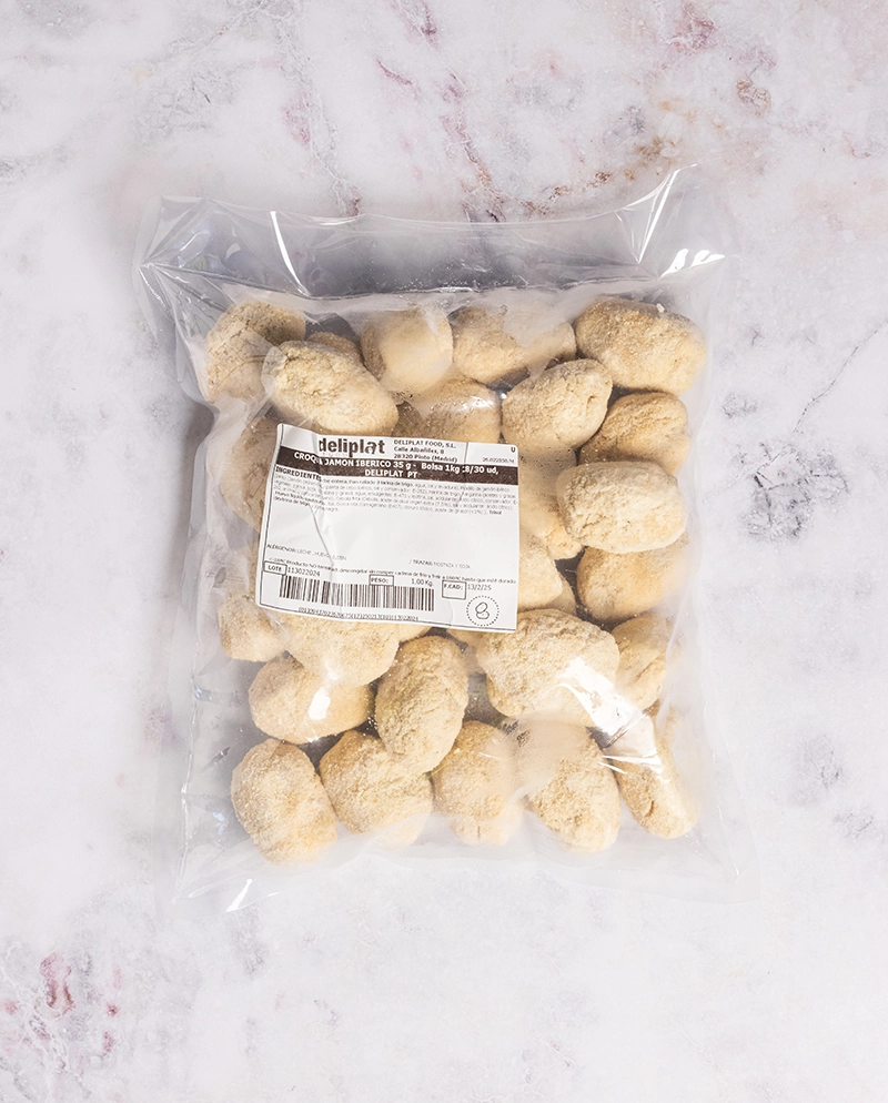 Clásica pero infalible. Con un aroma intenso y sabor marcado a jamón ibérico, presenta un tropezón correcto y agradable, perfectamente repartido. La bechamel es cremosa y estable, hecha con leche fresca, y el empanado fino y crujiente aporta el toque final. Ideal para todos los públicos.