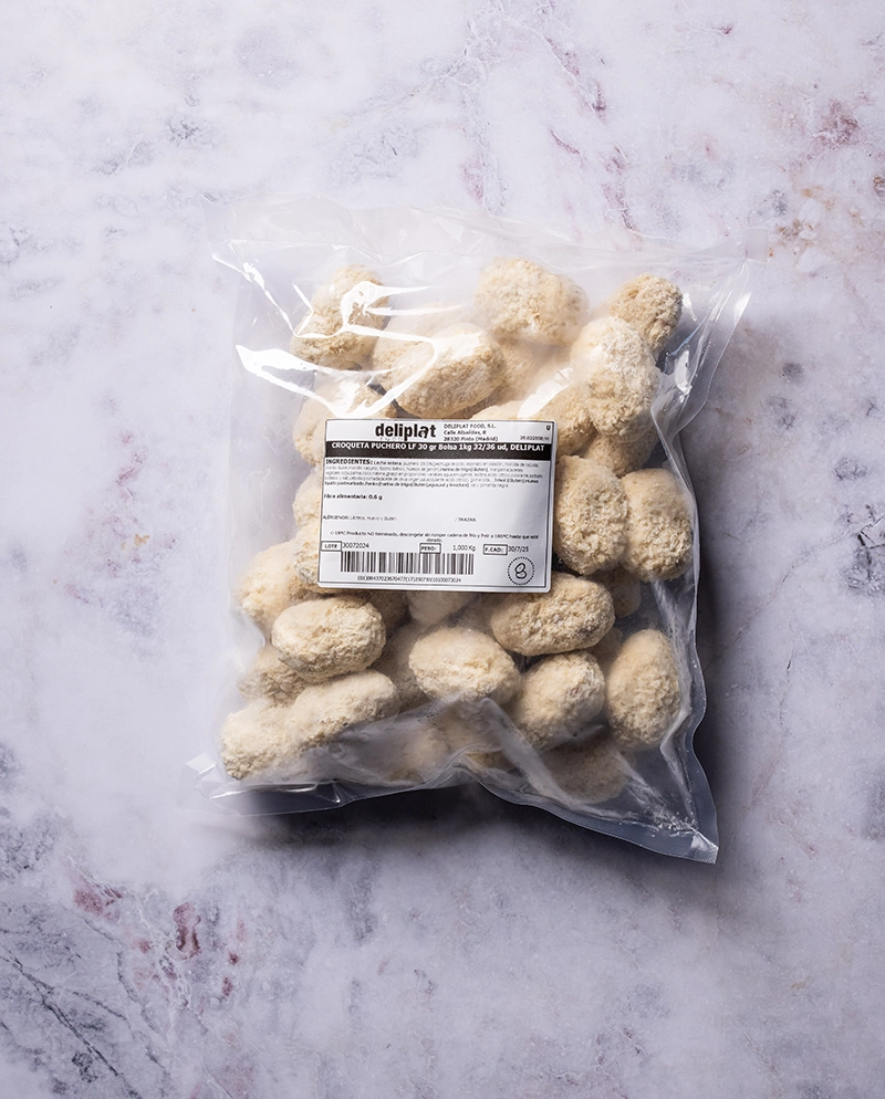 Aprovechamos este gran plato tradicional para elaborar una croqueta llena de sabor. Utilizamos todas las carnes del puchero: morcillo, morcilla, chorizo, tocino, pechuga de pollo, hueso de jamón, entre otros. El resultado es una croqueta con aroma a guiso casero, sabor potente y profundo, y un color variado, donde se aprecian trazas de cada carne. Bechamel cremosa y empanado fino y crujiente.